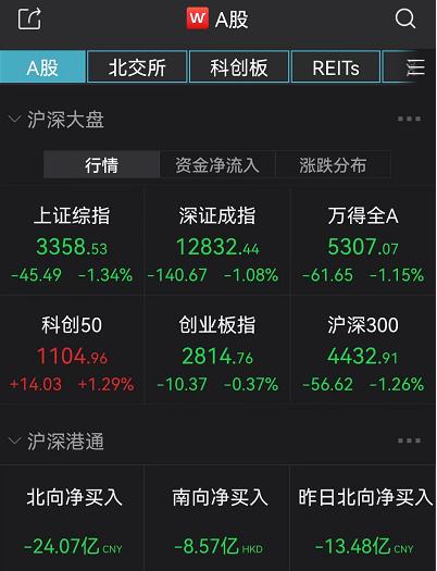 具体指数表现上,上证指数午盘报3358.53点,跌1.34%;创业板指报2814.76点,跌0.37%;上证50报3003.64点,跌1.59%;深证成指报12832.44点,跌1.08%;沪深300报4432.91点,跌1.26%;科创50报1104.96点,涨1.29%。
